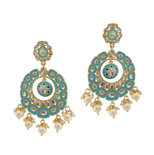 Moonstruck Traditional Indian Golden Chandbali Earrings with Meenakari & Pearls for Women β Light Aqua Enamel, Lightweight Alloy, 9cm Length, 31g Weight