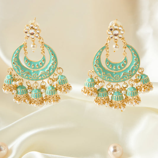 Moonstruck Traditional Indian Chandbali Enamel Kundan Earrings With Pearls for Women (Green)
