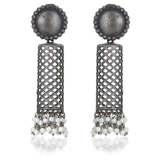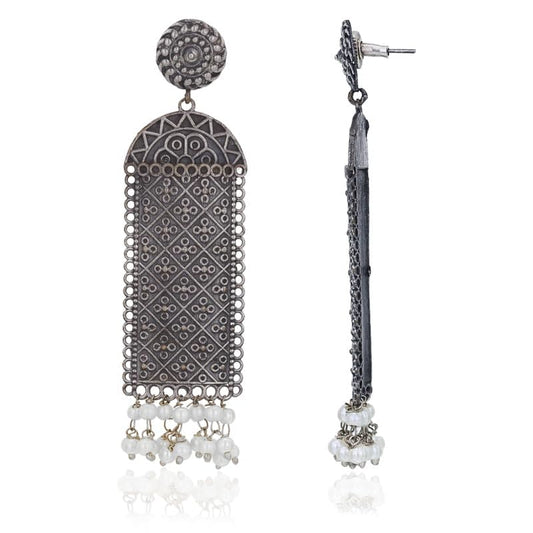 Moonstruck Fashion Jewellery Oxidized Silver Dangle Earrings with Pearl Fringe - Vintage Tribal Earrings for Women, Perfect for Ethnic Outfits, Festivals, Boho Style