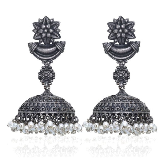 Moonstruck Traditional Indian Dome Shaped Floral Lightweight Oxidised Jhumka/Jhumki Earrings With Pearls for Women (Oxidised)