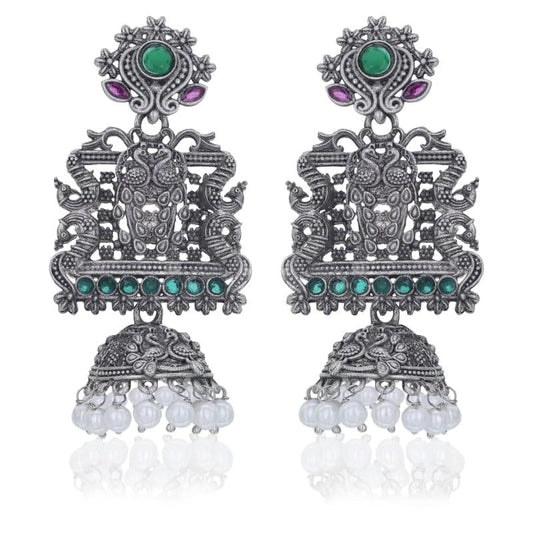 Moonstruck Fashion Jewellery Oxidized Silver Jhumka Earrings with Green & Pink Stones, Pearl Fringe - Traditional Temple Style Peacock Earrings for Women, Ideal for Weddings, Ethnic Wear