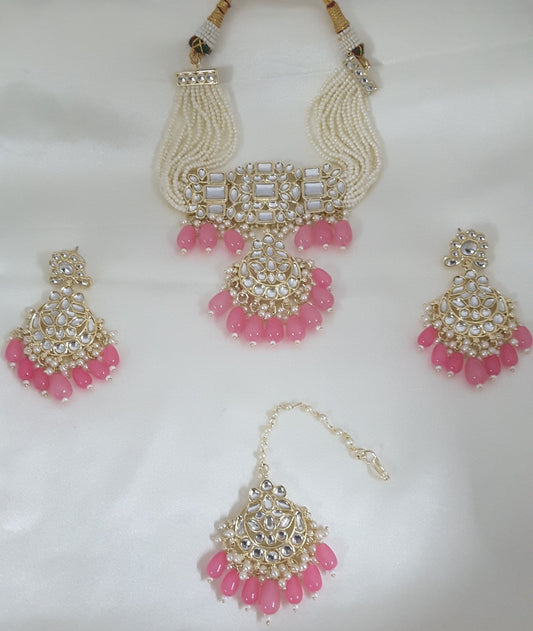 Moonstruck Traditional Indian White Kundan and Pink Beads Choker Necklace Earring Set with Maang tikka for Women(Pink)
