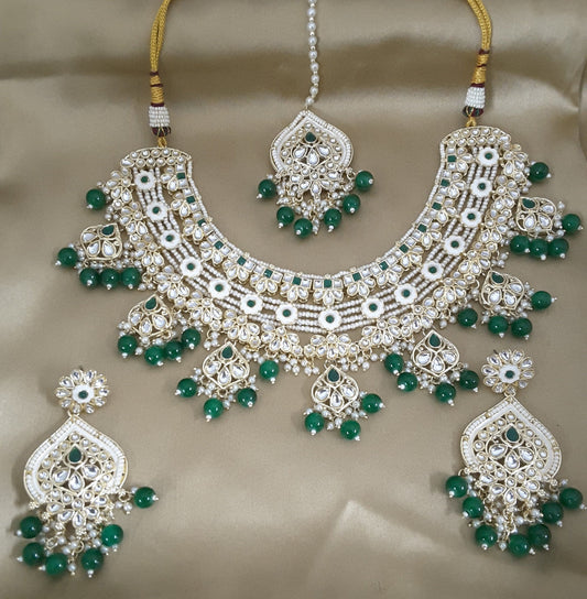 Moonstruck Traditional Indian Meenakari White Kundan and Emerald Green Beads Choker Necklace Earring Set with Maang tikka for Women(Emerald Green)