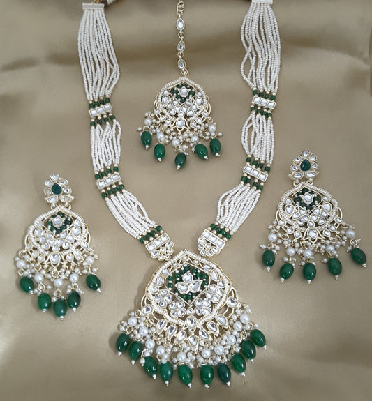 Moonstruck Traditional Indian White Kundan and Emerald Green Beads Long Regal Necklace Earring Set with Maang tikka for Women(Emerald Green)