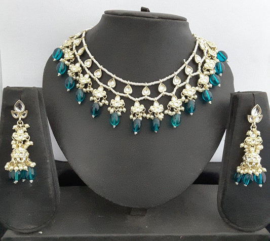 Moonstruck Traditional Indian White Kundan and Green Beads Choker Necklace Earring Set for Women(Peacock Green)