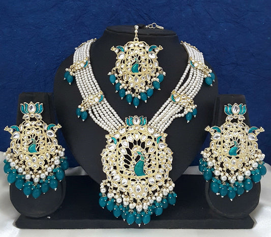 Moonstruck Traditional Indian Meenakari Peacock White Kundan and Green Beads Long Regal Necklace Earring Set with Maang tikka for Women(Peacock Green)