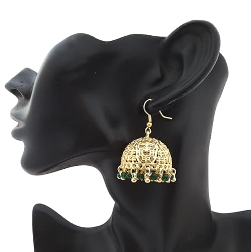 Moonstruck Traditional Indian Golden Jhumka Earrings for Women/Golden Ethnic Jhumki Earrings With Emerald Green Beads (Green)